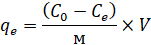 где: qe – количество ионов металла, поглощенных ионообменником (мг•г-1), C0 – начальная концентрация ионов металла (мг•л-1), Ce – равновесная концентрация ионов металла (мг•л-1); V – объем раствора (л); м – масса сухого сорбента (г).
