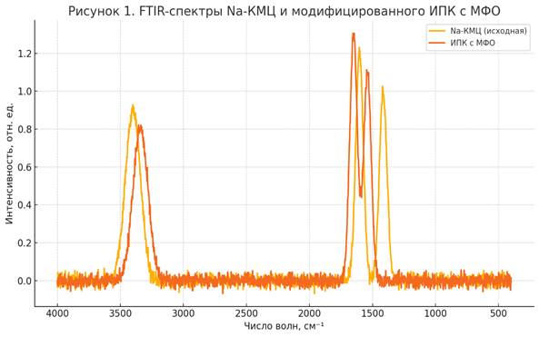 Вот график FTIR-спектров (Рисунок 1), демонстрирующий характерные полосы поглощения для: Na-КМЦ: пики при ~3400 см⁻¹ (O–H), 1603 см⁻¹ (COO⁻), 1415 см⁻¹ (симметричное растяжение COO⁻); ИПК с МФО: сдвиги и появление новых полос при ~3340 см⁻¹ (смещённая O–H), 1650 см⁻¹ (C=N), и 1540 см⁻¹ (N–H), указывающие на образование новых химических связей.