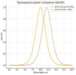 На графике показаны производные потенциометрических кривых dpH / dV, позволяющие точно определить эквивалентные точки титрования как пики этих кривых (рис.3): Пик синей кривой (исходная Na-КМЦ) наблюдается при объёме около 10 мл NaOH.