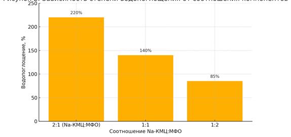 Водопоглощение. Немодифицированные ИПК проявляли водопоглощение до 220%, в то время как при введении МФО этот показатель снижался до 85–120% (рис. 4). Снижение связано с уменьшением свободных гидрофильных групп и образованием плотной пространственной структуры.