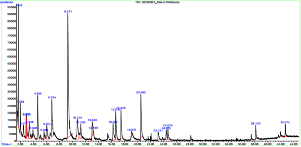 Рисунок 1. Хроматограмма ГХ-МС эфирного масла, полученного мeтодом гидродистилляции из цветков растения R. pseudoacacia