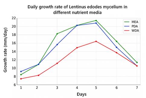 This graph shows the daily growth rate (mm/day) of Lentinus edodes mycelium on MEA, PDA, and WDA nutrient media.