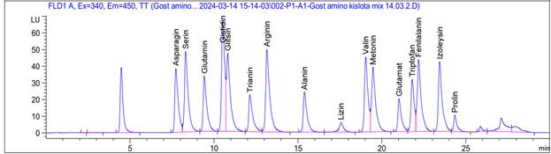 Рисунок 1. Хроматограмма, полученная из стандартных образцов 16 различных аминокислот