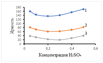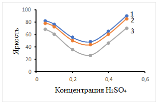 Рисунок 4. Изменение яркости цвета хлопчатобумажной ткани с металлокомплексом кобальта (II) под воздействием концентрации серной кислоты. Цвет окрашенной ткани: 1 – красный; 2 – желтый; 3 – зеленый