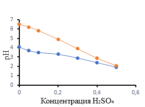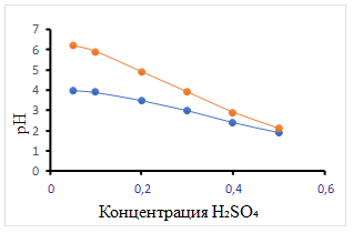 Рисунок 3. Изменение рН среды красильной ванны в зависимости от концентрации серной кислоты при обработке хлопчатобумажной ткани, содержащей металлокомплексы кобальта (II). Значение рН среды раствора: 1 – исходное; 2 – после обработки раствором комплексообразователей |