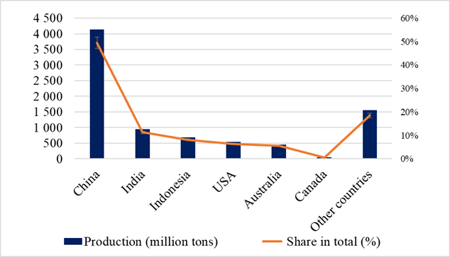 In 2022, global coal production reached 8.4 billion tons, an 8% increase compared to 2021. More than half of this amount—4.144 billion tons (50%)—was produced by China. India ranked second with 944 million tons (11%), followed by Indonesia with 687 million tons (8%), the United States with 539 million tons (6%), and Australia with 458 million tons (6%). These five countries accounted for 81% of global coal production. The remaining 19%—or 1.552 billion tons—was produced by other countries, such as Canada, which produced 47 million tons (1%) and ranked 14th. These statistics indicate that coal production is highly concentrated in a few countries, which significantly influences global energy security, trade policy, and climate negotiations (See figure 1).