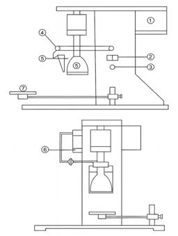 1 – Motor, 2 – Control buttons, 3 – Stirring speed regulator, 4 – Froth scraper, 5 – Flotation cell, 6 – Stirrer, 7 – Plate support, 8 – Flow meter