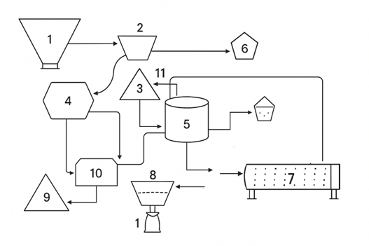 1 – Low-grade lignite, 2 – Vibrating screen, 3 – Crusher, 4 – Gravitational drum, 5 – Flotation reactor, 6 – Air compressor, 7 – Drying drum, 8 – Briquetting unit, 9 – Final product, 10 – Technological waste, 11 – Wastewater