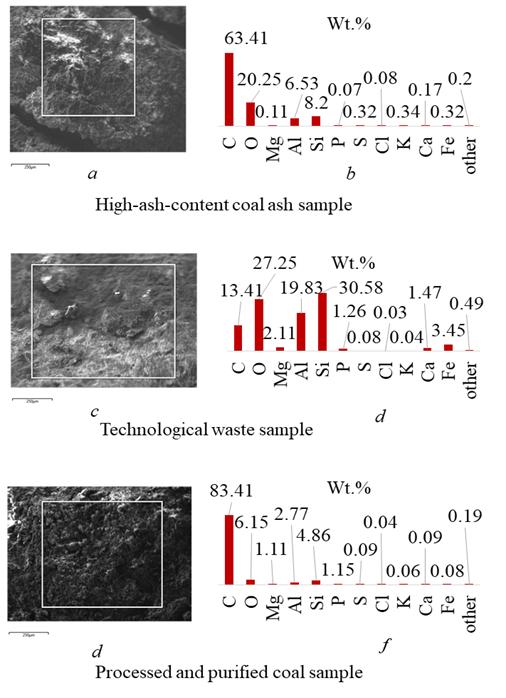 In the technological waste samples, the increased proportions of oxygen (30.58%) and silicon (19.83%), along with a reduced carbon content (down to 13.41%), indicate the effective separation of the combustible fraction during the beneficiation process. In the final enriched and purified coal, the carbon content increased significantly to 83.41%, while oxygen (6.15%) and silicon (4.86%) levels decreased, demonstrating the efficiency of the flotation process and the high concentration of the combustible fraction (Figure 4).