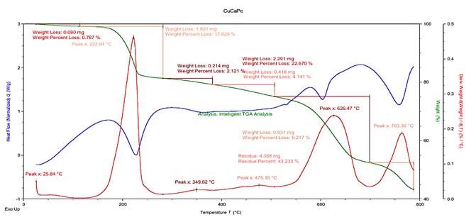 The derivatogram results suggest that the primary mass loss of the synthesized CuCaPc pigment takes place within the temperature range of 150 to 470 °C. Conversely, mass loss observed between 50 and 150 °C appears to be minimal.