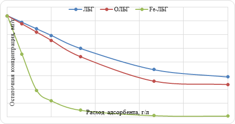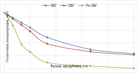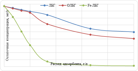 Наибольшую степень очистки обеспечивает Fe-модифицированный бентонит (Fe-ЛБГ). В образце воды № 1 уже при дозе адсорбента 1 г/л концентрация нефтепродуктов снижается на 17,6 % (до 716,5 мг/л), при 2 г/л – на 41,9 %, при 3 г/л – на 64,4 %. В диапазоне 5–15 г/л достигается практически полное удаление: при 5 г/л остаётся 72,2 мг/л (≈92 % удаления), при 15 г/л – 12,2 мг/л (>98 %).