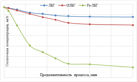 Снижение концентрации нефтепродуктов при дозе сорбента 2 г/л проходит в три стадии: быстрая адсорбция на внешних порах (30–60 мин), диффузия во внутренние щели и фазовое насыщение. Для Fe-ЛБГ за первые 60 мин снижение концентрации составило 41,9 %, что вдвое превышает показатели других образцов.