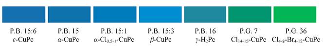 Figure 1. Shades of the main phthalocyanine pigments based on information about commercially available Heliogen pigments (BASF trademark).