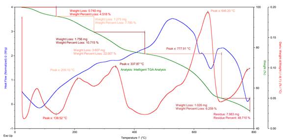 This TGA analysis demonstrated that the phthalocyanine-based organic compound possesses high thermal stability up to 800 °C. The substance decomposes in stages, with the greatest mass loss occurring around 646 °C. The results confirm that this compound can be used as a pigment suitable for high-temperature applications.