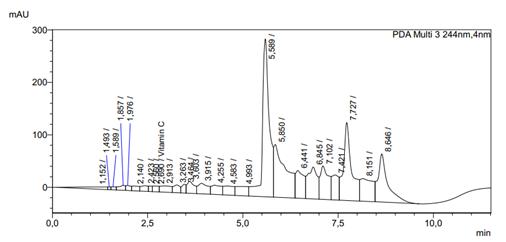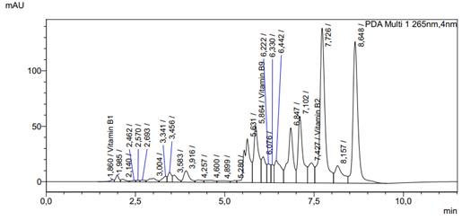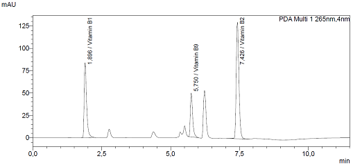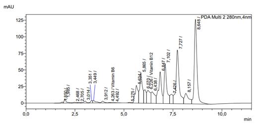 The chromatograms (Fig. 2) display peaks corresponding to vitamins B1, B2, B6, B9, B12, and vitamin C. The retention time of each vitamin remained stable, confirming the reliability of the analysis performed. The obtained chromatograms demonstrate good resolution and high sensitivity of the method.