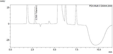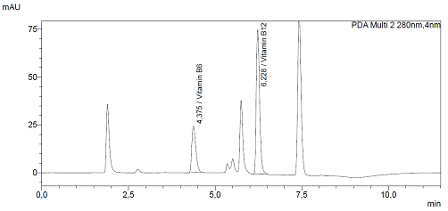Standard solutions of vitamins C, B1, B2, B6, B9, and B12 were prepared. Each vitamin was dissolved in water at a concentration of 100 mg/l, and working solutions were prepared in the range of 5, 10, 15, and 20 mg/l. Chromatographic analyses were performed on a Shimadzu LC-40 Nexera Lite high-performance liquid chromatography system equipped with an LC-40D pump, SIL-40 autosampler, SPD-M40 photodiode array detector, and Shim-pack GIST C18 analytical column [9,10]. A gradient elution program was used with acetonitrile (A) and 0.5% aqueous acetic acid solution (B) as mobile phases. Detection was performed at three wavelengths: 280 nm, 265 nm, and 244 nm. Quantitative analysis was based on retention times and peak maxima of standard vitamins. All measurements were performed in triplicate, and the mean values were calculated using standard statistical methods.