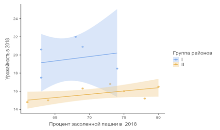 Нами проведен анализ зависимости урожайности хлопчатника от уровня засоления почв Республики Каракалпакстан. На графике (рис. 1) представлены следующие элементы: точки соответствуют данным по каждому району Республики Каракалпакстан, линии – линейная регрессия по этим данным, слабо закрашенная область – разброс стандартной ошибки.