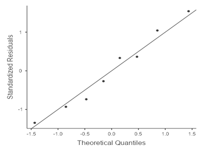 В кросс-корреляциях используется коэффициент Пирсона взаимной корреляции, принимающий значения от -1 до 1. Вышеприведенный график (рис. 2) квантиль-квантиль иллюстрируют отклонение от предположения о нормальности распределения для того, чтобы выявить систематические ошибки в анализируемых данных. Поскольку исходные данные сильно отклонялись от нормального распределения, то на графиках квантиль-квантиль для коррелограмм видны заметные случайные отклонения, но находящиеся в пределах применимости метода линейной регрессии.