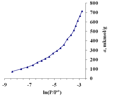 The adsorption isotherm of ammonia molecules on the Aerosil adsorbent is shown in Figure 1 in semi-logarithmic coordinates. The isotherm starts at a relative pressure of ln(P/P⁰) = –8.398, corresponding to an initial adsorption capacity of 73.841 µmol/g. As adsorption progresses, the curve gradually rises, reflecting the sequential uptake of ammonia molecules. At an adsorption level of 300 µmol/g, the relative pressure reaches ln(P/P⁰) = –5.11. In this region, ammonia molecules are mainly immobilized at specific adsorption sites on the Aerosil adsorbent, occupying internal surface layers associated with clay mineral domains. Further adsorption leads to a capacity of 400 µmol/g, corresponding to ln(P/P⁰) = –3.97. Beyond this point, the isotherm exhibits a steep upward trend along the adsorption axis, ultimately approaching saturation near 700 µmol/g. The saturated vapor pressure of ammonia at 303 K is 8456.35 mmHg. [13,14]