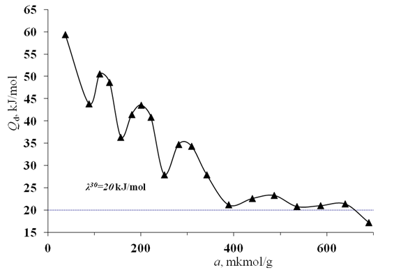 The differential heat of adsorption (Qd) of ammonia molecules on the surface of Aerosil is shown in Figure 2, exhibiting a wave-like decreasing trend. In the initial stages of adsorption, the Qd value decreases from 60.10 kJ/mol to 43.88 kJ/mol. This behavior indicates the gradual saturation of high-energy adsorption sites and the corresponding decline in adsorption enthalpy.