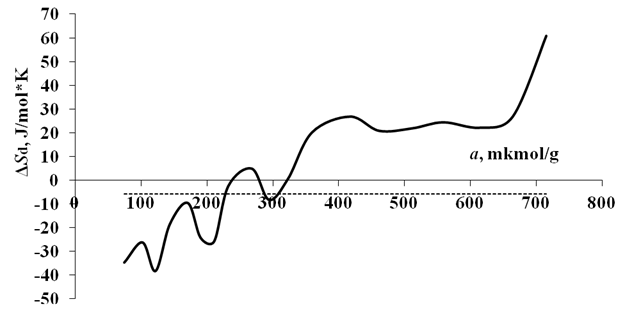 Figure 3 illustrates the differential entropy (ΔSd) of ammonia adsorption on Aerosil. These entropy values were calculated using the experimentally obtained isotherm and enthalpy data, applying the Gibbs–Helmholtz equation. The entropic characteristics provide deeper insight into the degree of molecular ordering and thermal interactions governing the adsorption process. [15]