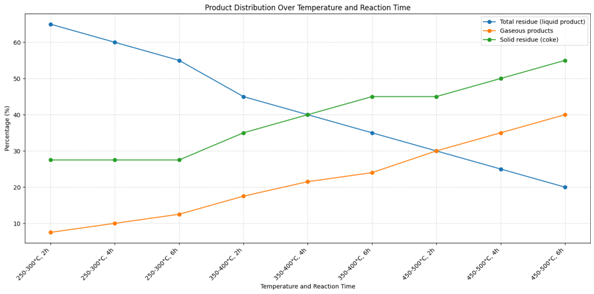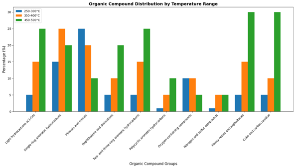 The composition of organic substances formed as a result of pyrolysis of the secondary heavy fraction (tar) at different temperatures changes significantly depending on the temperature. In general, as the temperature increases, the proportion of lighter, more volatile compounds decreases, while the formation of polycyclic aromatic hydrocarbons and coke increases (Figure 2):