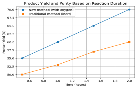 From the graph, at a reaction duration of 2 hours, the product yield was 60% in an inert atmosphere and 70% under air conditions.