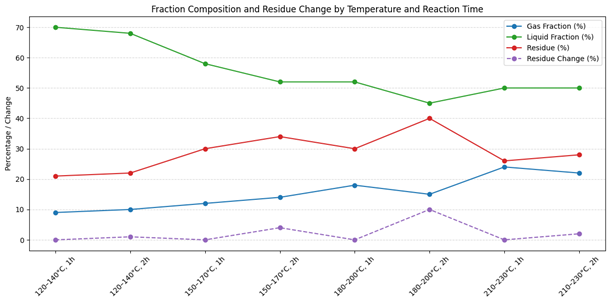 Additionally, the pyrolysis process was carried out at different times and temperatures, and the results were analyzed. Changes in reaction time and temperature during pyrolysis were found to have a significant impact on the composition of the products, including the yields of gas, liquid, and resin fractions (Figure 5).