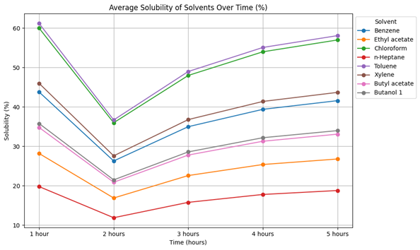 Experimental results show that the solubility of petroleum polymer resin increases with both temperature and time. In the 70–75 °C range, benzene stands out as an effective solvent, while in the 80–120 °C range, toluene and xylene demonstrate higher efficiency. Over time, solubility increases across all solvents; however, certain solvents like n-heptane maintain a relatively low solubility level.