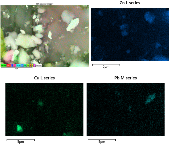 Из результатов исследования энергодисперционного элементного состава, показанных на приведенной выше диаграмме, полученной с помощью сканирующей электронной микроскопии, видно, что на верхнем пике исследуемого образца обнаруживается до 12,3 % серы, причем основным включением являются сульфидные минералы сфалерита, галенита, ковеллина и пирита в сочетании с алюмосиликатами.