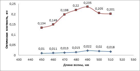 По результатам измерений оптической плотности раствора препарата «Медроник,99mТс» и раствора плацебо на рисунке 1, можно увидеть, что спектр раствора, приготовленного для количественного определения метилендифосфоновой кислоты, имеет максимум поглощения при длине волны 490 нм (в области от 450 до 510 нм), а раствор плацебо в этом диапазоне длин волны не имеет максимумов. Таким образом, результаты доказывают, что разработанная методика является специфичной для количественного определения MDP.