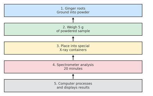 The mineral content in the roots of Zingiber officinale Rose was determined using the X-ray fluorescence spectrometry method with the Spectro Expose III (USA) device. This instrument operates at a voltage of 120/230 V and has a power capacity of 150 W. For the analysis, the ginger roots were first ground into a fine powder. Then, 5 grams of the powdered sample were carefully weighed and placed into special containers designed for X-ray analysis. These containers, mounted onto circular discs, securely held the powdered samples during the procedure. The spectrometer analyzed the samples for about 20 minutes. Once the analysis was complete, the results were automatically processed and displayed on a computer connected to the device, from which the experimental data were recorded [6–62].