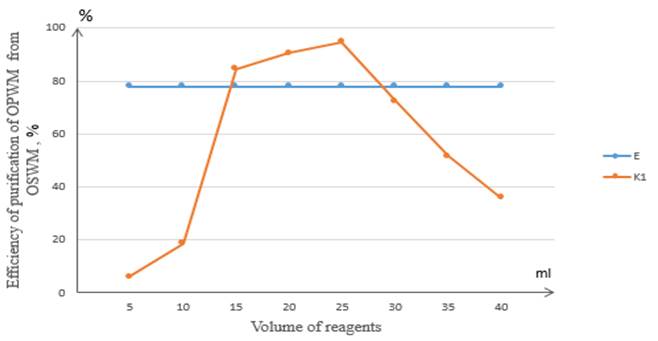 Figure 1. The dependence of the efficiency of the purification of OPM from OSM on the volume of the initial gasoline fraction used as an extractant – ε, and the dependence on the volume of a 5% solution of Fe2(SO4)3 compound as a coagulant – K1