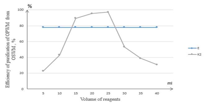 Figure 2. The dependence of the efficiency of the purification of OPM from OSM on the volume of the initial gasoline fraction used as an extractant – ε, and the dependence on the volume of a 5% solution of Al2(SO4)3 compound as a coagulant – K2