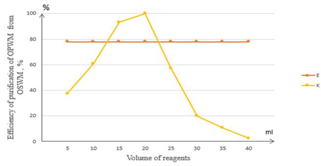 Figure 3. The dependence of the efficiency of the purification of OPM from OSM on the volume of the initial gasoline fraction used as an extractant – ε, and the dependence on the volume of a mixture of a 5% solution of Fe2(SO4)3 and Al2(SO4)3 compounds in a 1:1 ratio – K