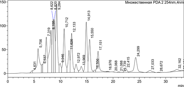 Рисунок 1. ВЭЖХ хроматограмма анализируемой фракции трёхрёберника дисковидного