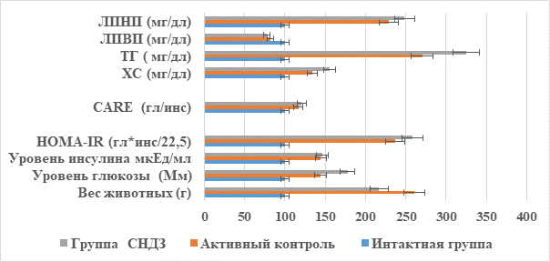 В крови животных с моделью СНДЗ обнаружены изменения в углеводном (увеличение содержания глюкозы, гликированого гемоглобина, показателей инсулиннорезистетности HOMA-IR) и в липидном обмене (увеличение триглицеридов, холестерина и ЛПВП).