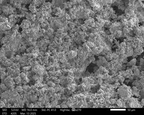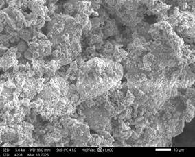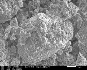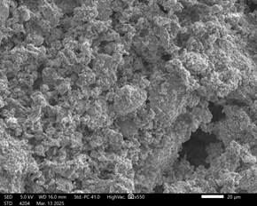 Морфологические особенности поверхности образцов исследовались с использованием сканирующего электронного микроскопа SEM EVO MA 10 (Zeiss, Германия). Пробоподготовка включала нанесение порошкообразного образца (или приклеивание кусочка образца) на держатель с алюминиевой фольгой. Мелкодисперсные порошки предварительно прессовали в таблетки. Держатель с образцом помещали в вакуумную камеру микроскопа. Исследования выполнялись при ускоряющем напряжении 15 кВ и рабочем расстоянии 8,5 мм. Получение изображений осуществлялось в диапазоне масштабов от 200 до 10 мкм с применением программного обеспечения SmartSEM в режиме детектирования обратно рассеянных электронов (BSD).