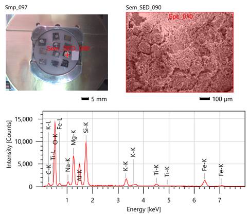 Рисунок 2. Результаты энергодисперсионного анализа (SEM-EDS) образца Smp_097: расположение области анализа, SEM-микрофотография и соответствующий спектр EDS