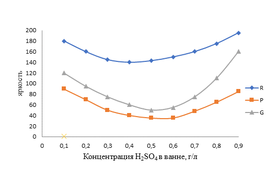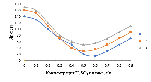 Рисунок 3. Зависимость изменения яркости составляющих окраски хлопчатобумажной ткани, содержащей металлокомплексы никеля (II) от концентрации серной кислоты в обрабатывающей ванне