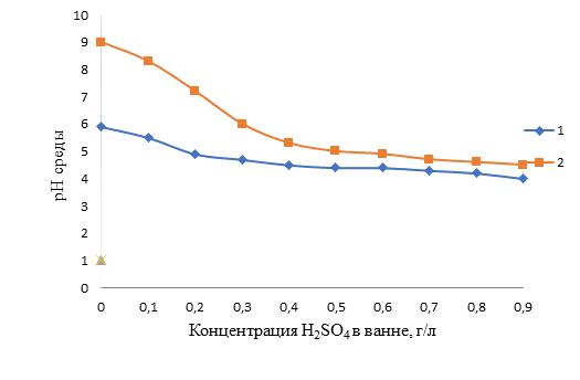 1 – рН раствора до обработки комплексообразующим раствором, 2 – рН раствора после обработки комплексообразующим раствором.