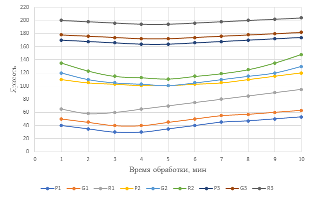Образцы хлопчатобумажной ткани, никельсодержащие металлоком-плексы, имеют зеленую окраску, имеющую максимум поглощения в красных области спектра. Следовательно, наименее ярким каналом оказался розовый (Р), а наиболее ярким — красный (R) (рис. 3).