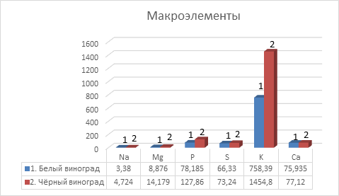 В соках белого и чёрного винограда определены содержания следующих макроэлементов: натрий, магний, сера, кальций, фосфор и калий. Сумма макроэлементов в соках белого и чёрного винограда составляет соответственно 1040 мг/100 г и 1827,5 мг/100 г, что составляет 94,5% и 96,5 % (Табл.1).