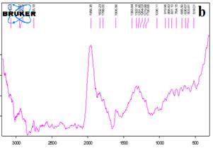 Как видно из рамановского спектра монтмориллонита на рис.2.а., имеются полосы в области 1030–1050 см⁻¹ (валентные колебания связи –Si–O), 790–800 см-1 (связанные с тетраэдрами –SiO4), а также 460–470 см-1 (характерные для связи O–Si–O) указывающие наличие в нем оксида кремния в составе минерала. Полосы в области 3400 и 1630–1650 см-1 соответствуют колебаниям молекул воды. Интенсивная полоса в области 910–920 см-1 связана с колебаниями группы –Al–OH. А полоса в области 520–550 см-1соответствует деформационным колебаниям –Si–O–Al, что подтверждает устойчивость алюмосиликатного каркаса.