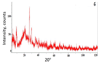 На дифрактограмме монтмориллонита (рис.3.а.) видны несколько чётких пиков, указывающие его кристаллическую структуру. А на дифрактограмме композита (рис.3.б.) содержащего 40 масс.% монтмориллонита, наблюдается только частичное проявление кристалличности. Это указывает на то, что в процессе получения композиции происходит частичное разрушение структуры минерала, то есть, эксфолиация - разделение слоистой структуры монтмориллонита на отдельные слои.