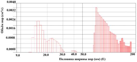 Рисунок 4. Гистограмма распределения объёма пор композиций, содержащих 40 масс.% бентонита