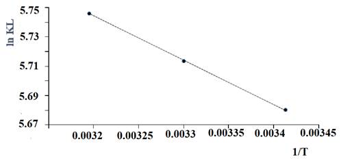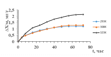 Как видно из рис.5, с повышением температуры увеличивается сорбция красителя. Это указывает, что процесс сорбции имеет химический характер.