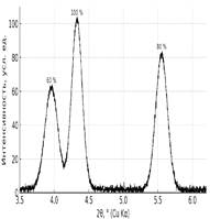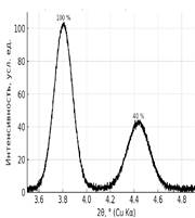 При насыщении 75 % КОЕ основной максимум смещается в область 2,04 нм и становится доминирующим (100 %), что свидетельствует о преобладании упорядоченного бислоя углеводородных радикалов. При этом сохраняется пик 1,59 нм (80 %), фиксирующий остаточные области с наклонным монослоем, а также отражение 2,23 нм (60 %), связанное с локальными участками квази-трёхслойной упаковки.