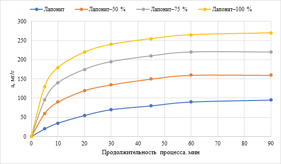 Наиболее высокие показатели наблюдаются при 100 % насыщении КОЕ. Уже в течение первых 15 минут удаляется около 70 % красителя из раствора, а равновесие наступает через 40–45 минут. Максимальная сорбционная ёмкость достигает ≈ 260–280 мг/г, что более чем в 2,5 раза выше по сравнению с немодифицированным лапонитом.