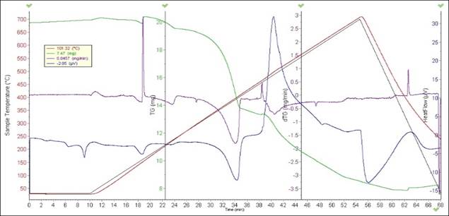 Рисунок 2. Дериватограмма шлихты на основе крахмала, натриевой соли карбоксиметилцеллюлозы, ГИПАНа, натриевой соли альгиновой кислоты и калиевой соли триполифосфорной кислоты